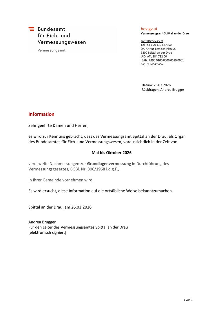 Von Mai bis Oktober 2026 führt das Vermessungsamt Spittal an der Drau Nachmessungen zur Grundlagenvermessung durch.